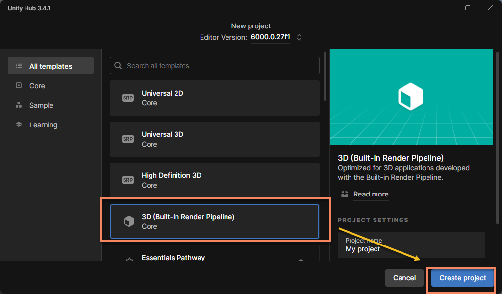 If you are using Unity 6, you need to manually download and use the 3D (Built-In Render Pipeline) Template. By default, it is located further down in the template list.