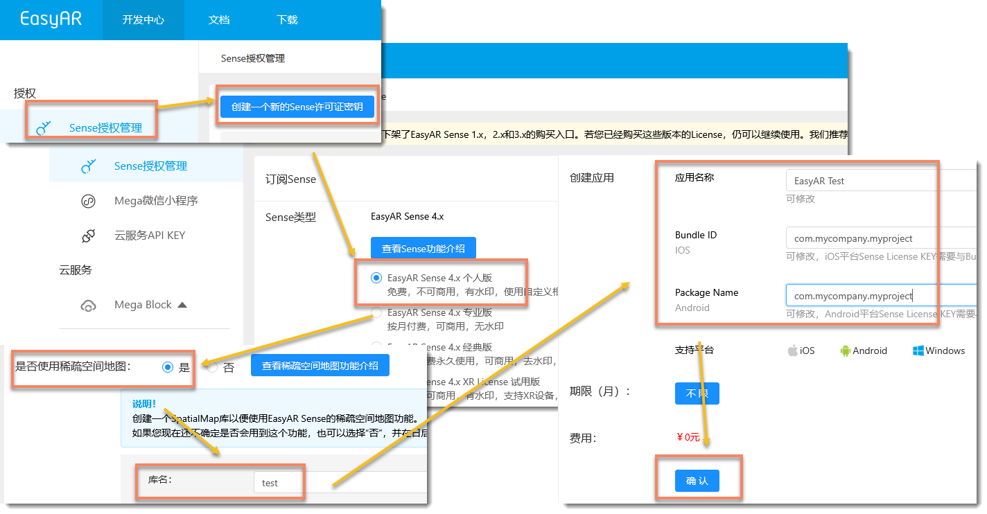 The EasyAR Sense License can be created from the EasyAR Developer Center (Chinese, English). For first-time use, you can follow these steps to create one: