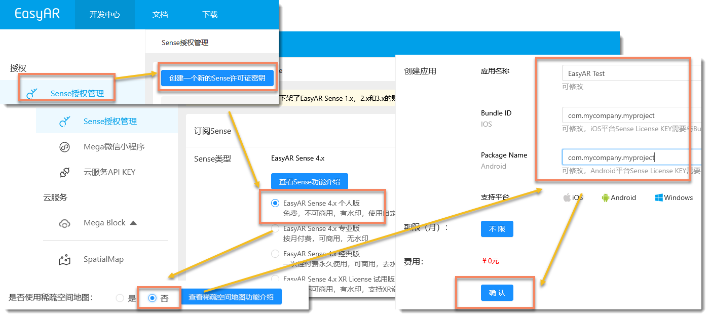 EasyAR Sense License can be created from the EasyAR Developer Center. For first-time use, follow these steps to create one: