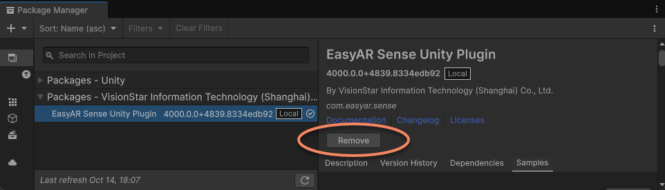 - Reopen the Unity project and remove the old version of EasyAR Sense Unity Plugin from the project.