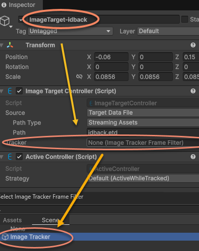 Re-specify the ImageTrackerFrameFilter for ImageTarget-idback in the scene: