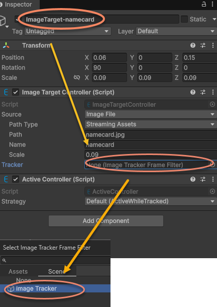 Re-specify the ImageTrackerFrameFilter for ImageTarget-namecard in the scene: