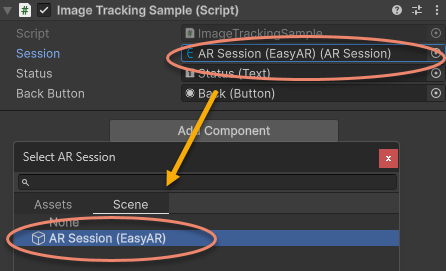 Re-specify the ARSession in the sample script to the newly created AR Session (EasyAR):